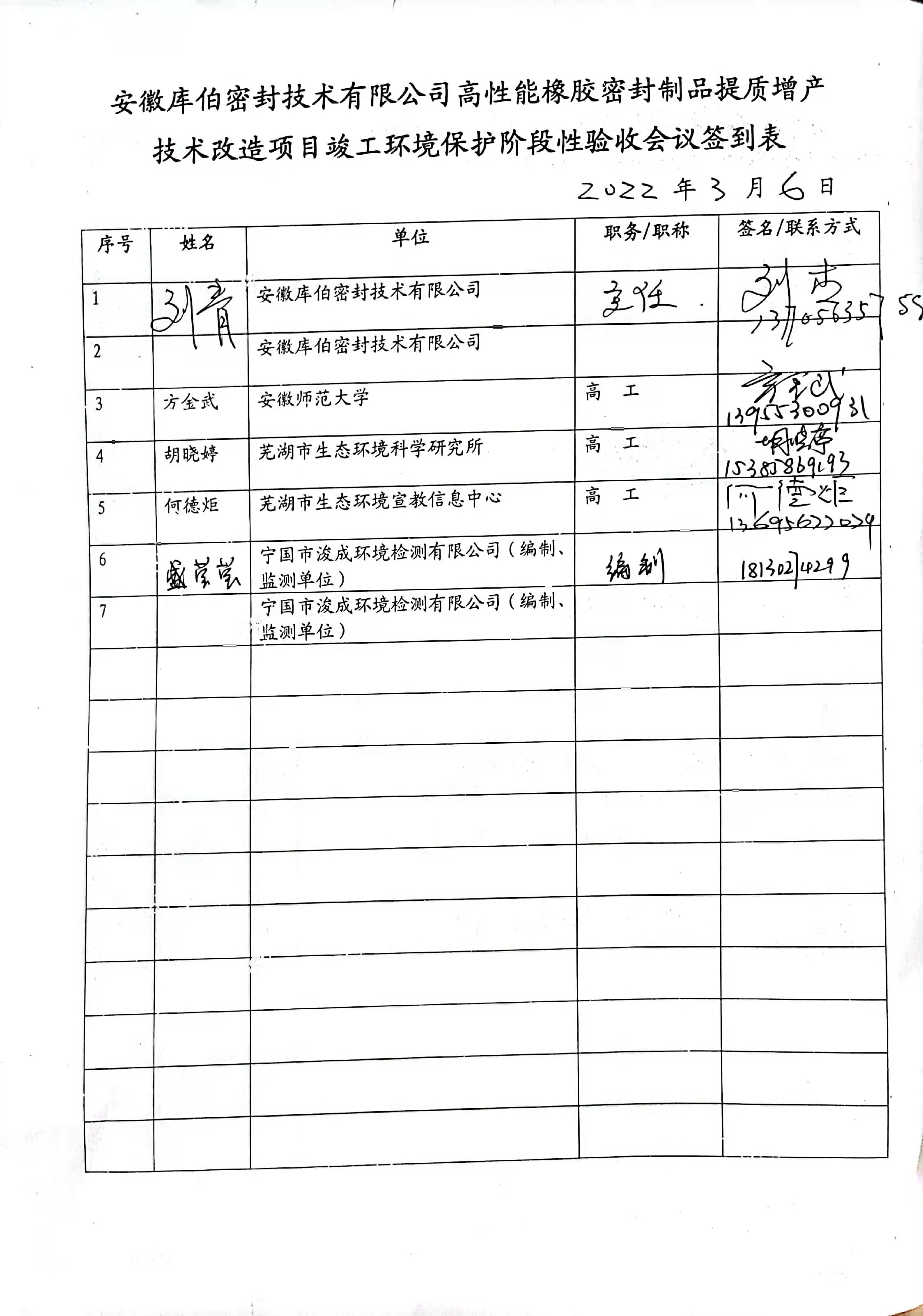 安徽库伯密封技术有限公司高性能橡胶密封制品提质增产技术改造项目前期环保审查、审批手续齐全。已阶段性建成的密封件生产车间(1#厂房)、预成型车间、产品清洗车间及配套环保设施已落实环境影响报告表及批复要求,具备阶段性环境保护验收条件,验收组认为本项目阶段性竣工环境保护验收合格。